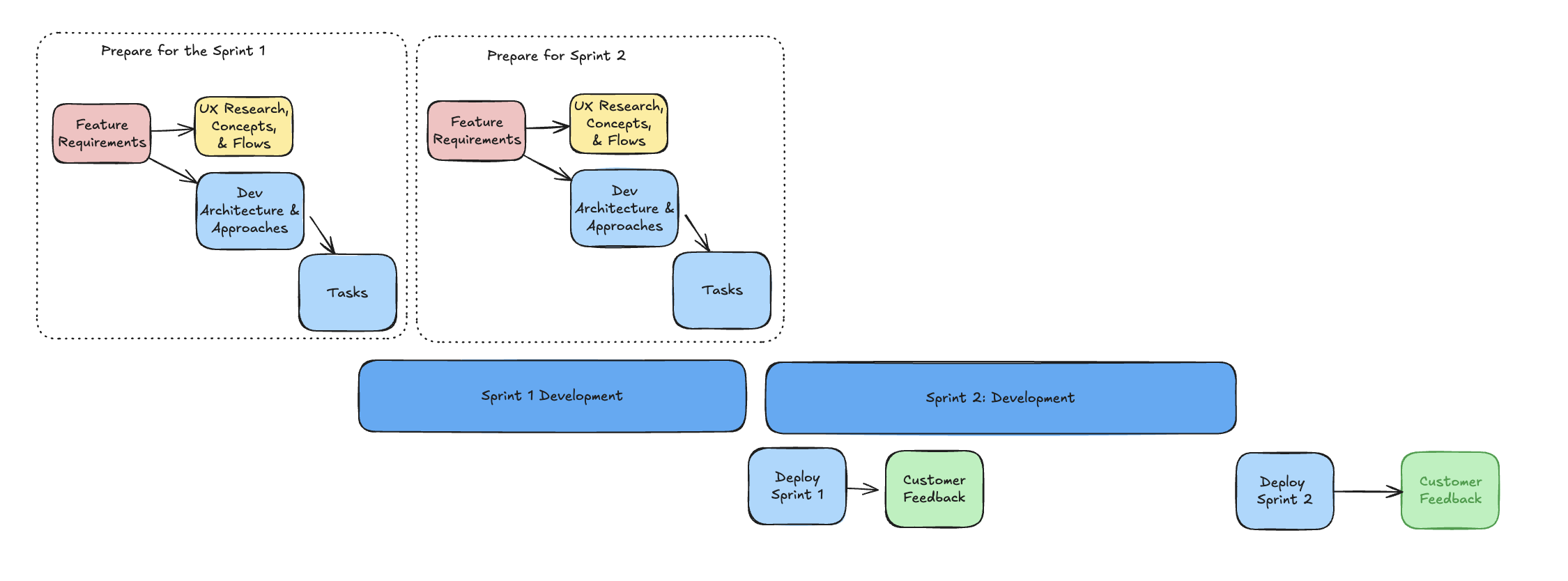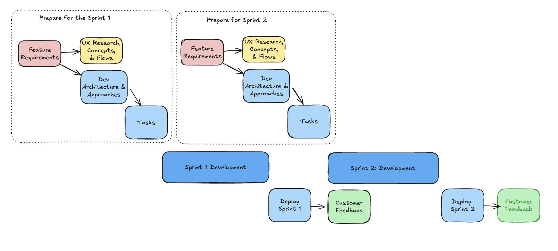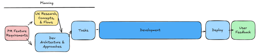 A more lightweight, but still coordinated/managed process for a feature team working, prototyping, and coding with AI looks like this. This is how we are trying to do it at Stravu: