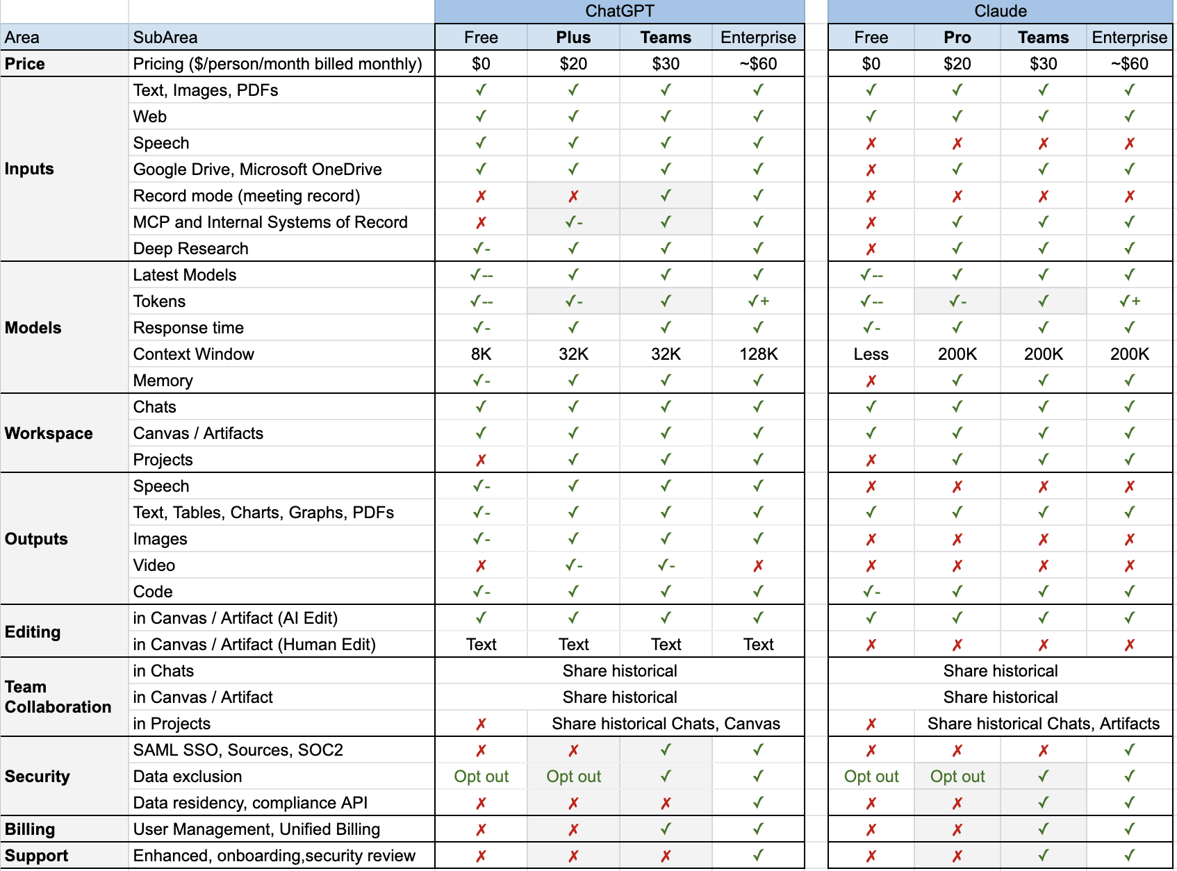 | Area | SubArea | ChaGPT Free | **ChatGPT Plus** | **ChatGPT Teams** | ChatGPT Enterprise | | Claude Free | **Claude Pro** | **Claude Teams** | Claude Enterprise |