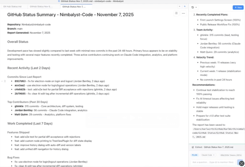 Nimbalyst takes this further by integrating AI-assisted git analysis directly into your markdown-based planning workflow. Your plans and actual development stay connected, status updates happen in context, and you maintain a clear picture of progress without leaving your planning documents.